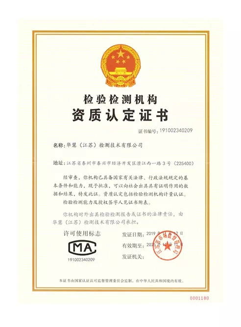 热烈祝贺华慧(江苏)检测技术有限公司获得检验检测机构资质认定证书(CMA)。